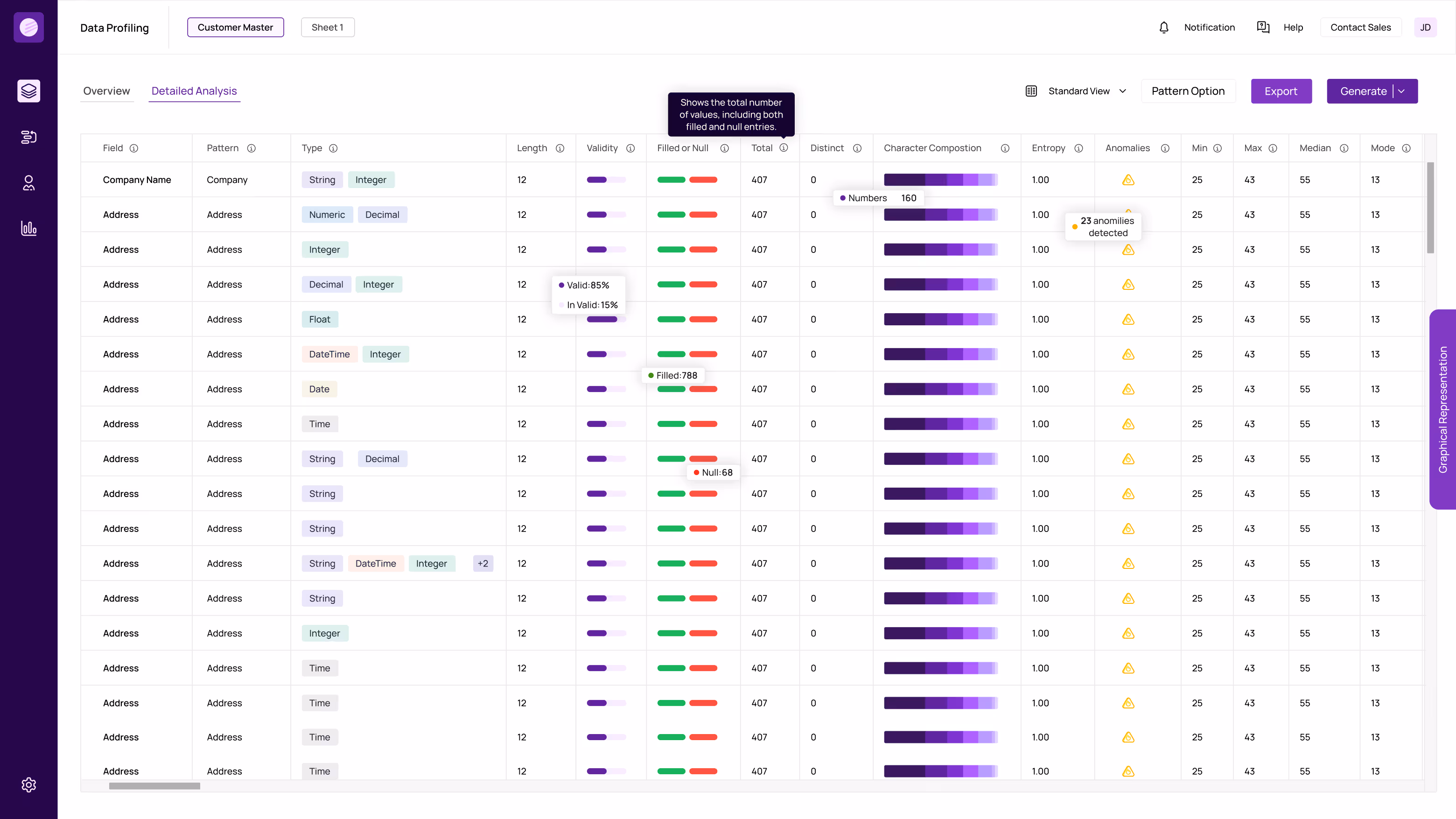 Profile every field, format, and pattern across millions of records simultaneously. Get completeness percentages, uniqueness scores, and format distributions. One scan shows everything wrong with your data.