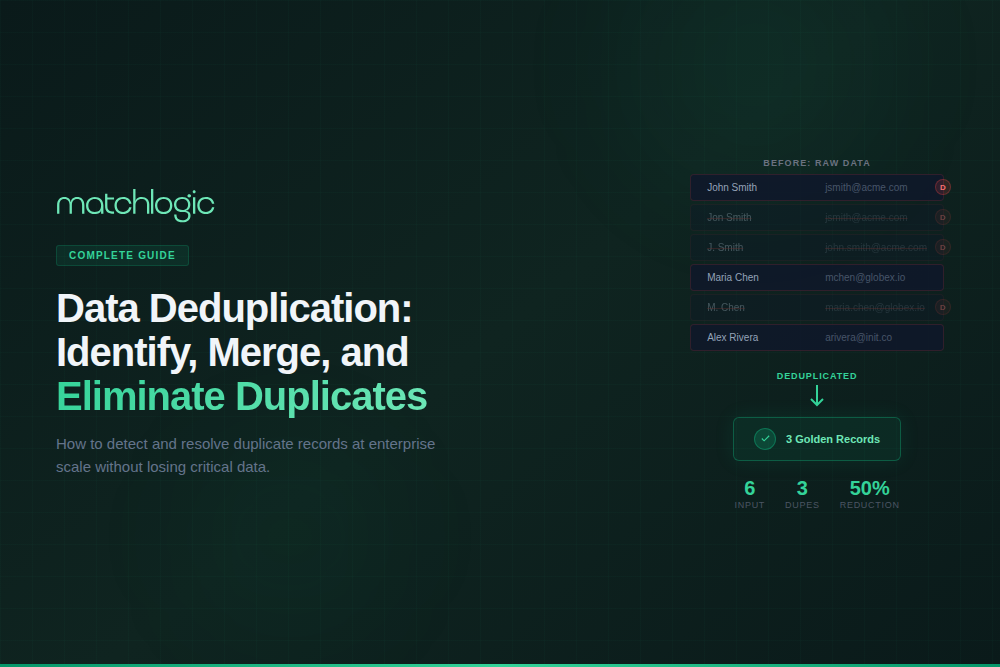 Duplicate records are not a minor inconvenience. According to Gartner, poor data quality costs organizations an average of $12.9 million per year, and duplicate records are one of the most common and measurable contributors. Enterprises typically discover 25–35% duplicate records in their first deduplication scan (MatchLogic customer benchmarks). This guide covers how duplicates form, the techniques used to find them, the [INTERNAL LINK: 3C, merge purge process] for eliminating them, and best practices for keeping your data clean permanently.