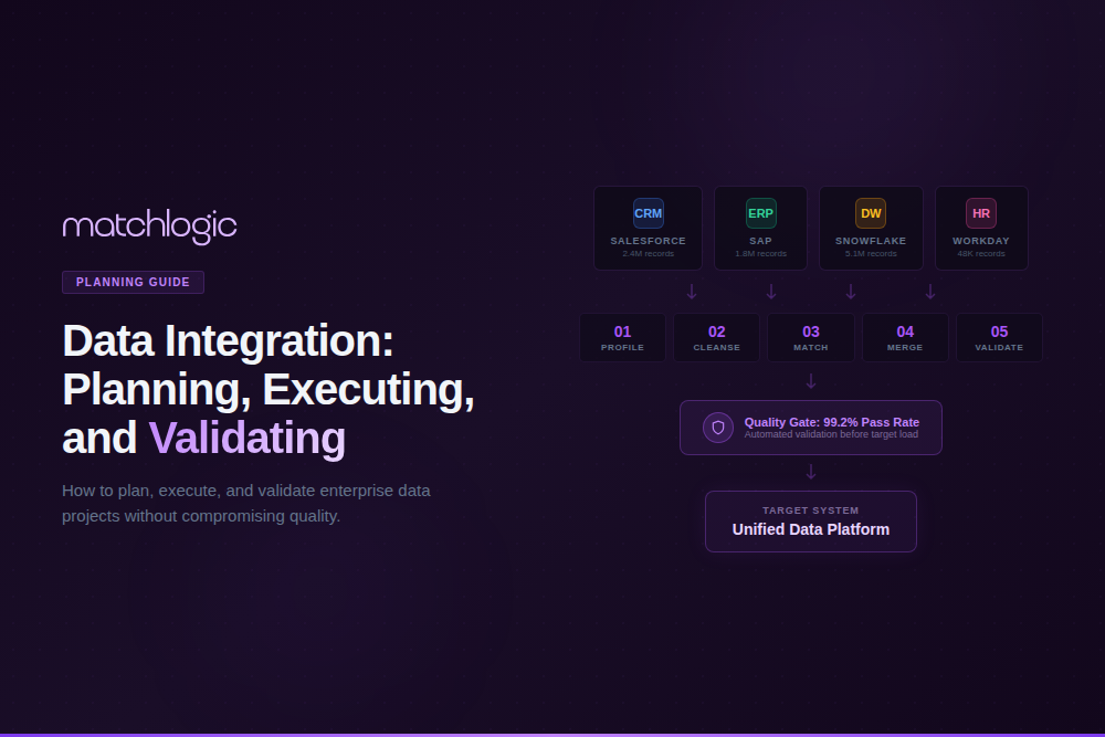 MatchLogic provides the data quality layer for enterprise integration projects: profiling that reveals source quality in seconds, cleansing and standardization that fix issues before extraction, cross-source matching that prevents duplicate imports, and validation tools that confirm target quality after load. All processing runs on-premise for organizations where data residency during migration is non-negotiable.