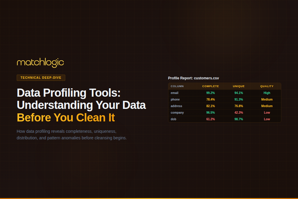 Image alt text: "MatchLogic data profiling tools dashboard showing field-level completeness, uniqueness, and format distribution analysis across enterprise datasets."