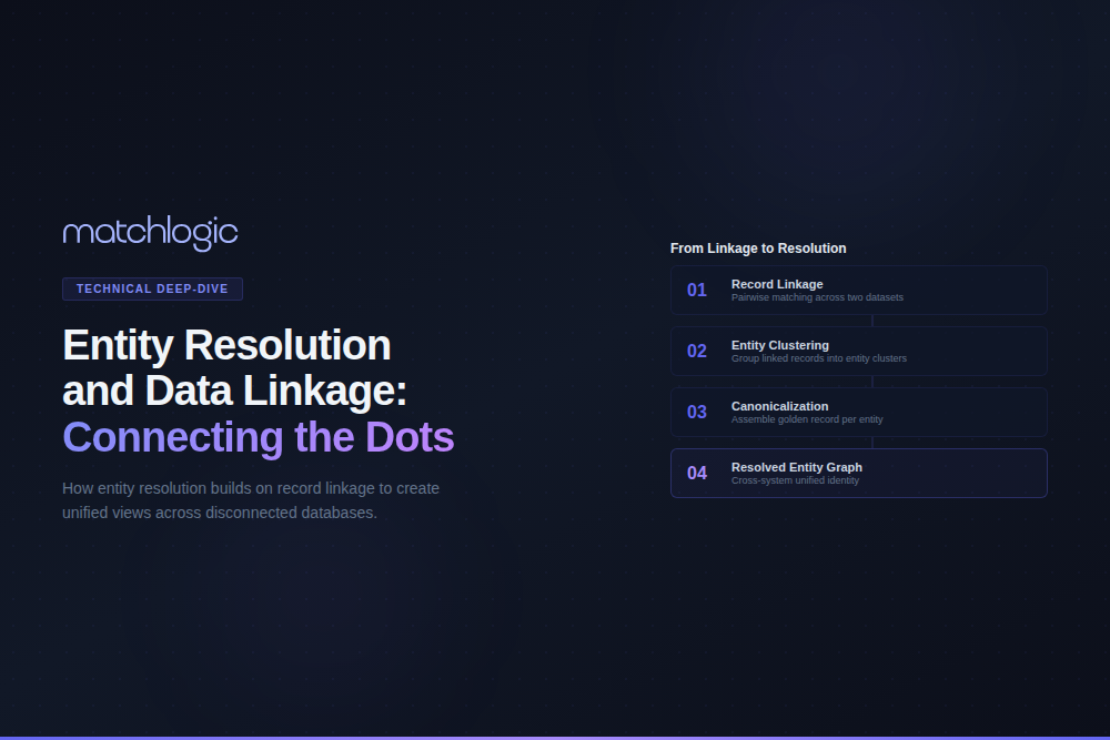 Entity resolution data link age is the process of identifying records across two or more separate databases that refer to the same real-world entity (a person, organization, product, orlocation) and connecting them into a unified view, even when no shared unique identifier exists between the systems. Data linkage is the matching mechanism; entity resolution is the broader process that uses linkage results to cluster,merge, and produce a single trusted profile for each entity. For enterprises operating across multiple CRM, ERP, billing, and operational systems,cross-database linkage is the technical foundation that makes single-customer views, master data management, and regulatory compliance achievable. This guidecovers the relationship between data linkage and entity resolution, thetechniques that make cross-database matching work, and how to implement linkageat enterprise scale. [INTERNAL LINK: /resources/entity-resolution-guide, entityresolution guide]