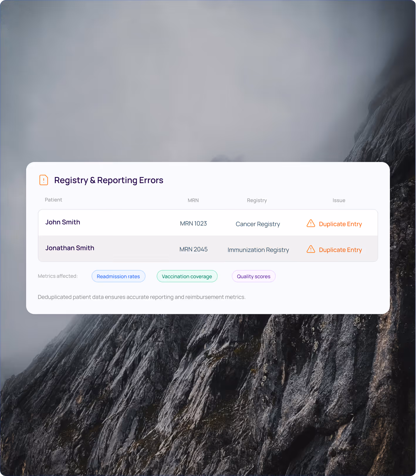 Quality measures, cancer registries, immunization reporting, and population health analytics all depend on accurate patient counts. If the same patient appears twice, they get counted twice. Readmission rates look different. Vaccination coverage percentages shift. Quality scores that determine reimbursement rates are calculated on inaccurate denominators. MatchLogic deduplicates patient records before data is submitted to registries and reporting systems, so the numbers reflect the actual patient population.
